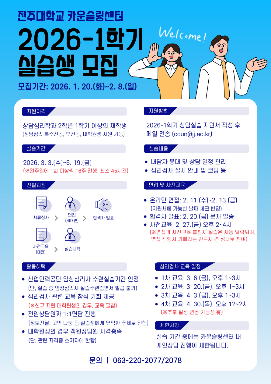 안녕하세요. 전주대학교 카운슬링센터입니다. 새학기를 맞아 2026학년도 1학기 상담실습생을 모집합니다. 실제 상담 현장에서의 생생한 실무 훈련을 경험하고 싶은 분들의 많은 지원을 기다립니다. 아래의 내용을 꼼꼼히 확인해 주시길 바랍니다. 1. 모집기간: 2026. 1. 20.(화)~2. 8.(일) 2. 지원자격: 상담심리학과 2학년 1학기 이상의 재학생(상담심리학 복수전공, 부전공, 대학원생 지원 가능) 3. 지원방법: 첨부 파일의 상담실습 지원서 작성 후 이메일 제출 (coun@jj.ac.kr) ※ 파일명은 ' 2026-1학기 상담실습 지원서(김OO) ' 로 맞추어 제출 4. 실습기간: 2026. 3. 3.(수)~6. 19.(금)