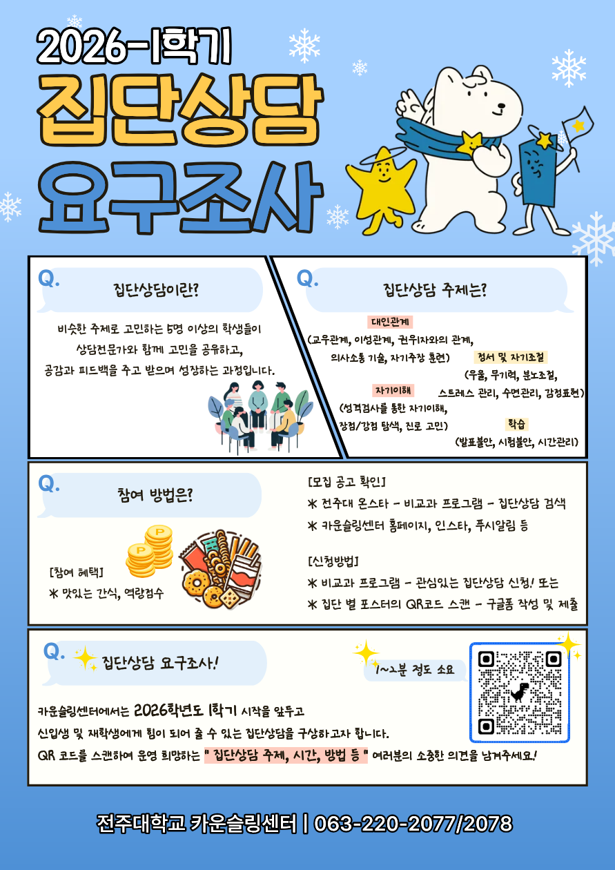 안녕하세요. 전주대학교 카운슬링센터입니다. 카운슬링센터에서는 2026학년도 1학기 시작을 앞두고, 신입생 및 재학생에게 힘이 되어 줄 수 있는 집단상담을 구상하고자 합니다. 아래 구글 폼 링크를 클릭하여 운영 희망하는 "집단상담 주제, 시간, 방법 등" 여러분의 소중한 의견 남겨주세요! *집단상담: 비슷한 주제로 고민하는 5명 이상의 학생들이 상담전문가와 함께 고민을 공유하고, 공감과 피드백을 주고 받으며 성장하는 과정 *집단상담 주제: 대인관계, 정서 및 자기조절, 자기이해, 학습 *참여방법: 전주대 온스타-비교과 프로그램-집단상담 검색 등 포스터 참고 *참여혜택: 맛있는 간식, 역량점수 *요구조사 링크: https://forms.gle/oJFa6y6ruG3TJGWd7 문의) 카운슬링센터 063-220-2077 / 2078 |
